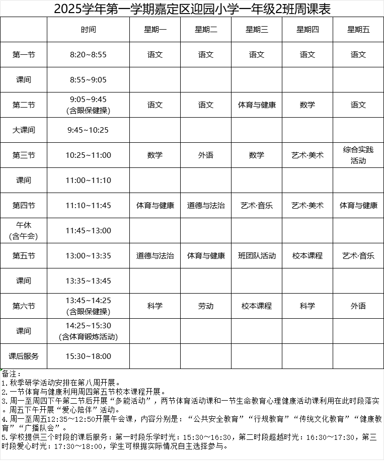 迎园小学2025学年第一学期一年级(2)班周课表