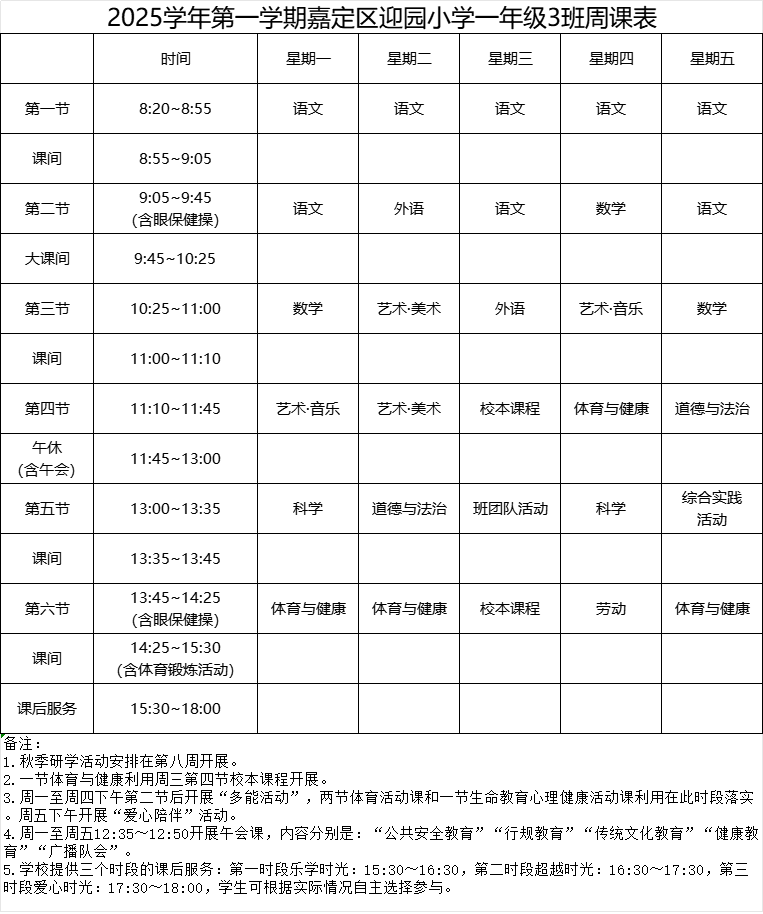 迎园小学2025学年第一学期一年级(3)班周课表