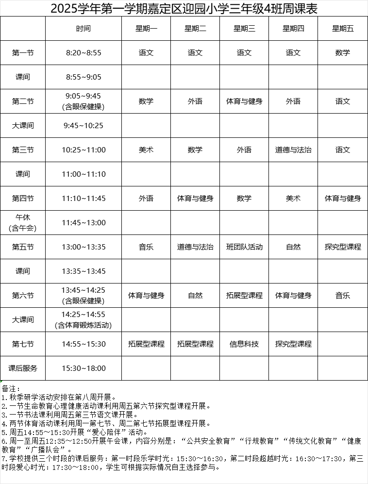迎园小学2025学年第一学期三年级(4)班周课表