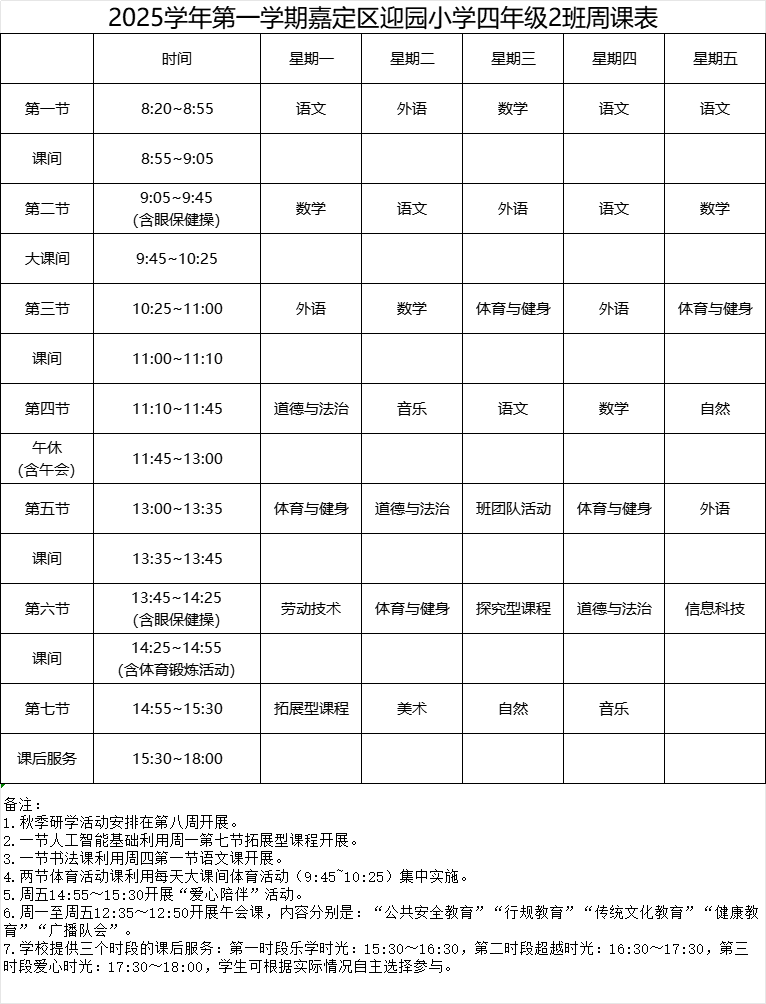 迎园小学2025学年第一学期四年级(2)班周课表