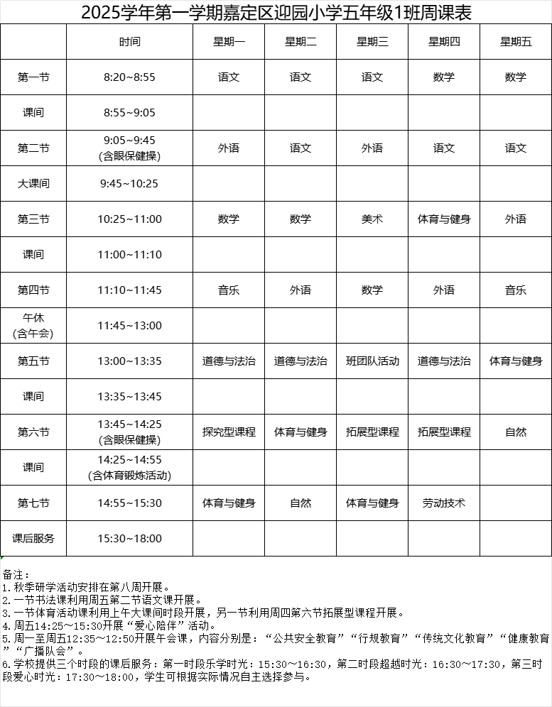 迎园小学2025学年第一学期五年级(1)班周课表